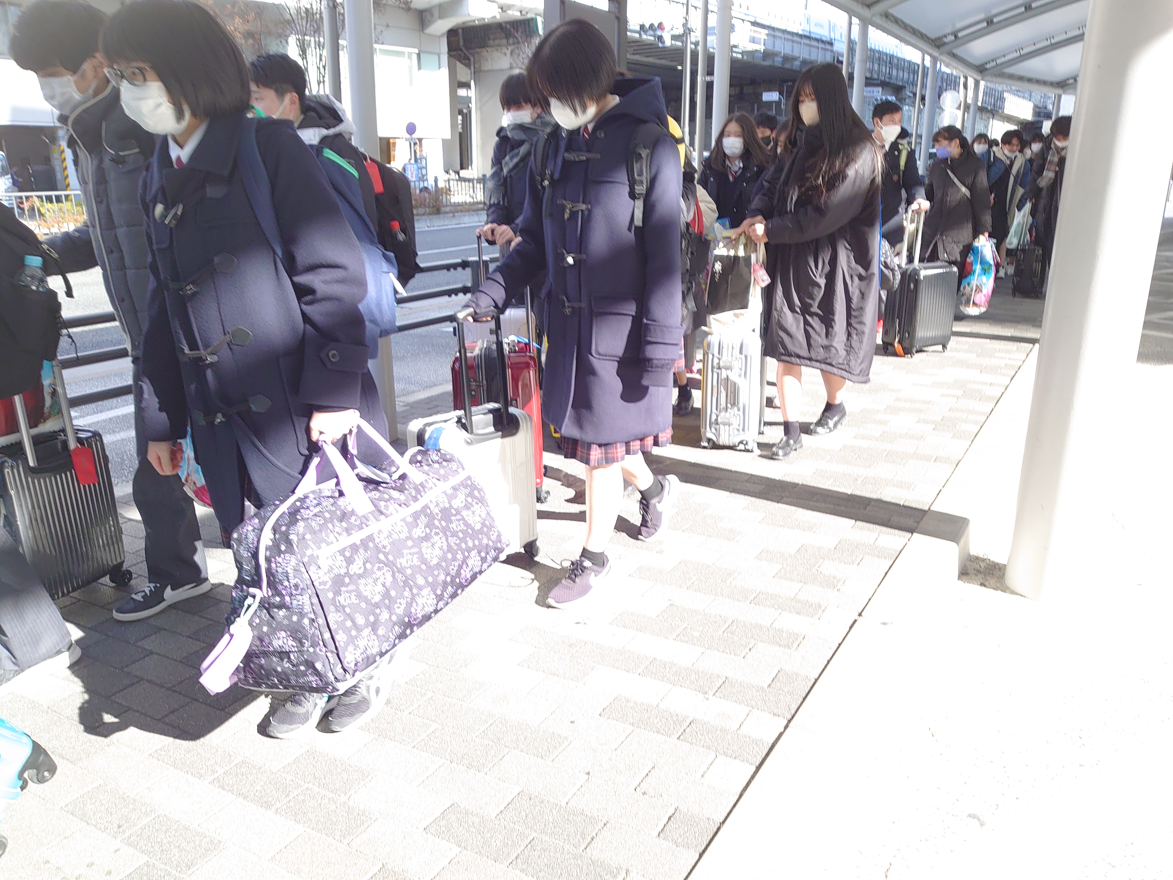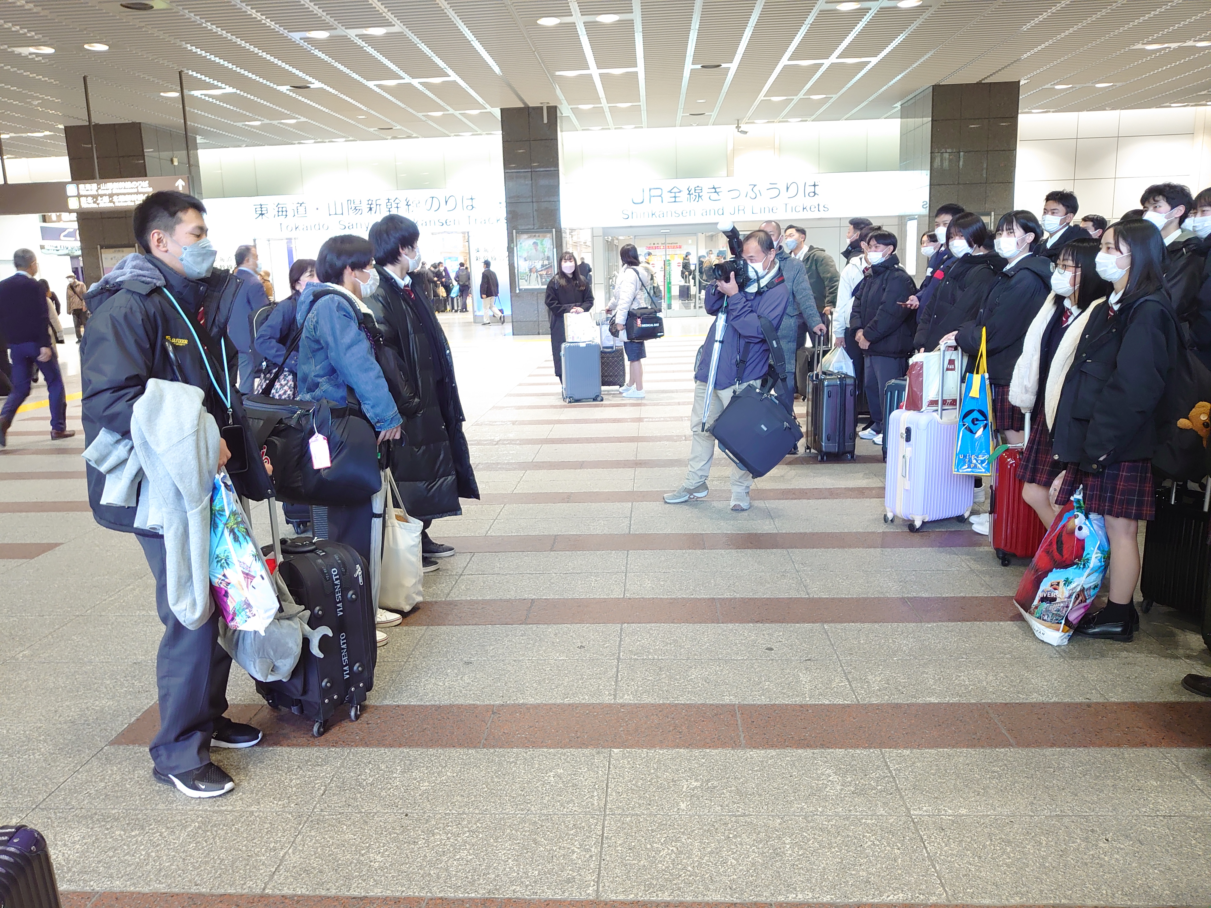 以上で修学旅行の全行程が終了となりましたが、ここからが最大の山場 である帰路へ向かうという重要な行程が残されています。「行きはよいよい 帰りは恐い」すでに疲労困憊な体に、昨日までに購入したお土産の山がボディ ブローのように生徒の体力を奪っています。京都から古川まで新幹線を乗り 継いで帰還するわけですが、その間、キャリーバッグとお土産を抱えての階段、新幹線の乗降が控えています。 まずは東京へ向かうため、京都駅へ。ここで、関西在住の生徒とお別れです。 まずはゆっくり休んでください。お疲れさまでした。