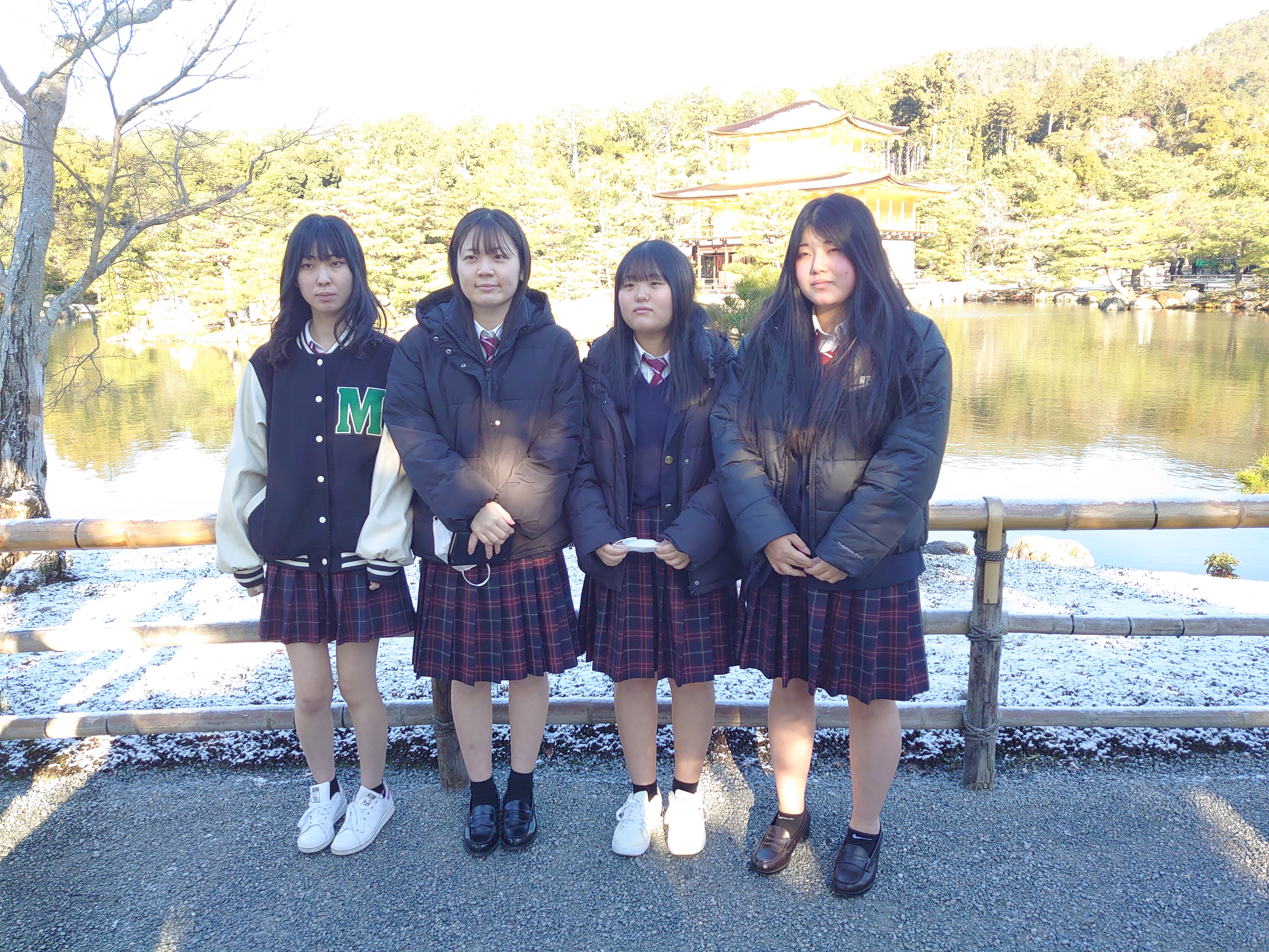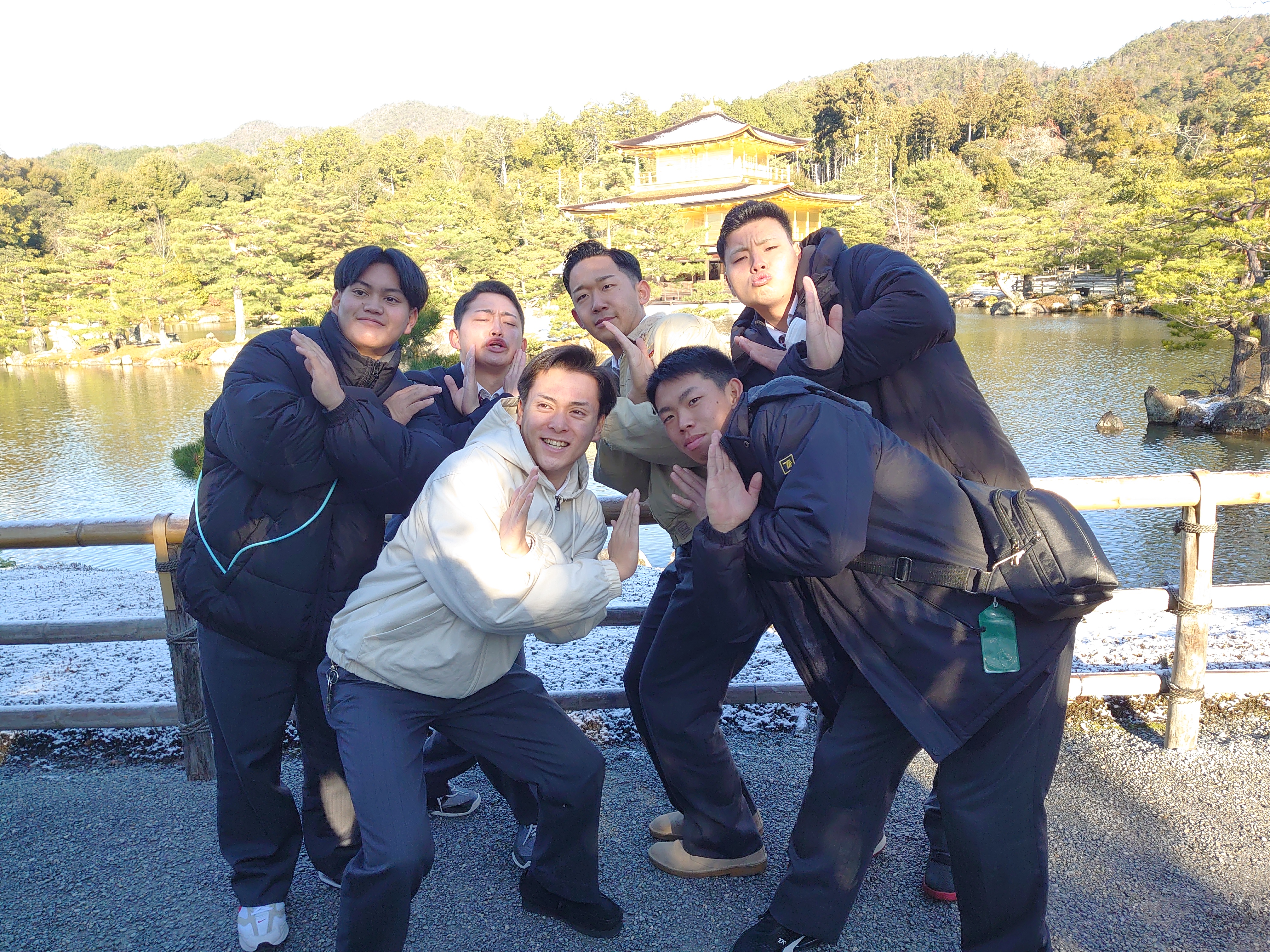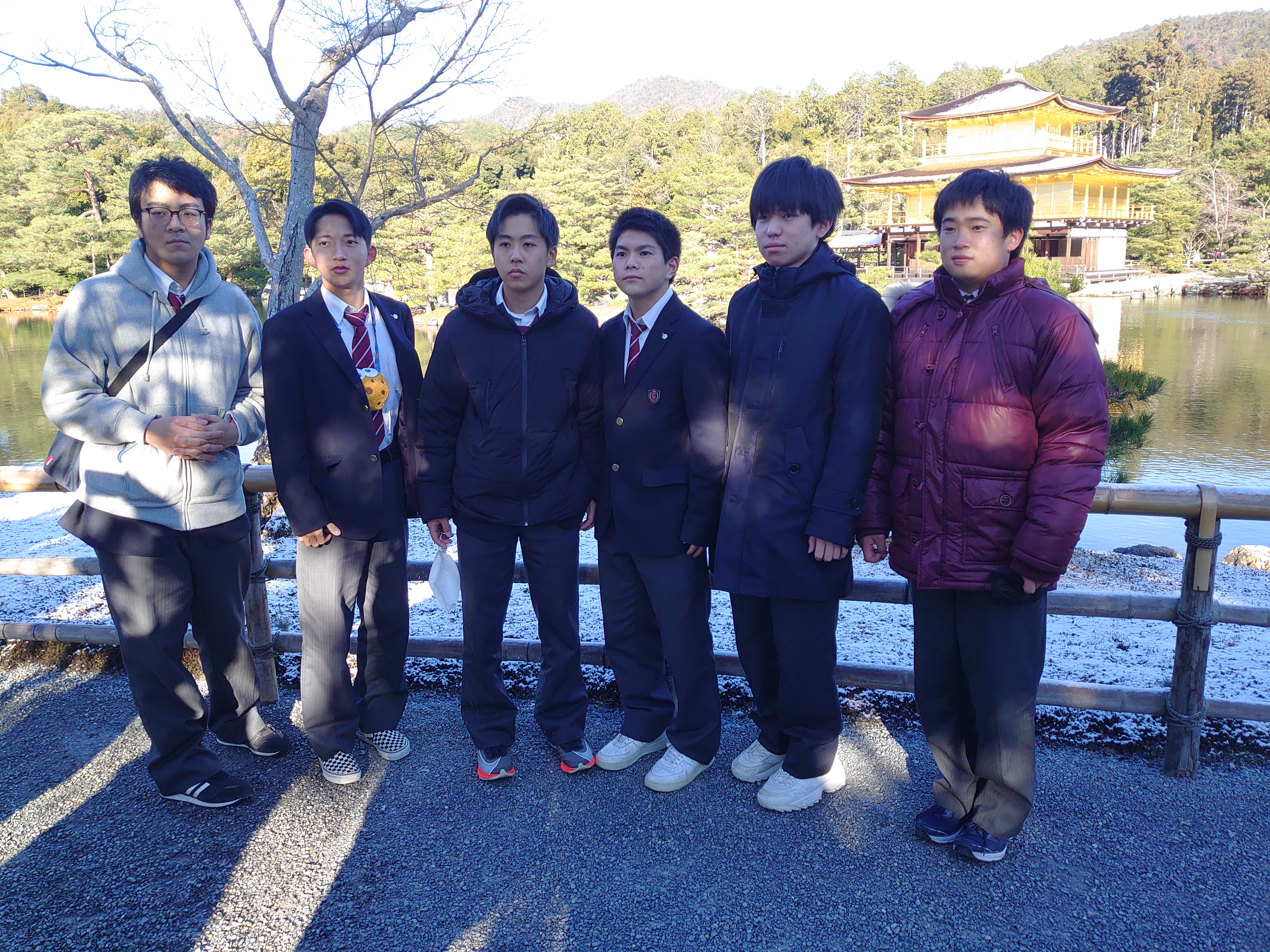 まず向かった先は鹿苑寺金閣。8:55頃に到着し、駐車場へ向かうと 団体客は本校のみ。ほぼ貸し切り状態で見学することができました。開門と 同時に入場し、金閣寺が見えるスポットへと移動すると、そこには雪を まとった金閣寺が現れました。パンフレットに掲載されているような屋根を すべて覆いつくす雪景色ではありませんでしたが、それでも雪がかかった 金閣寺は珍しいということで、ここでも普段は見られない貴重なものを拝見 することができました。