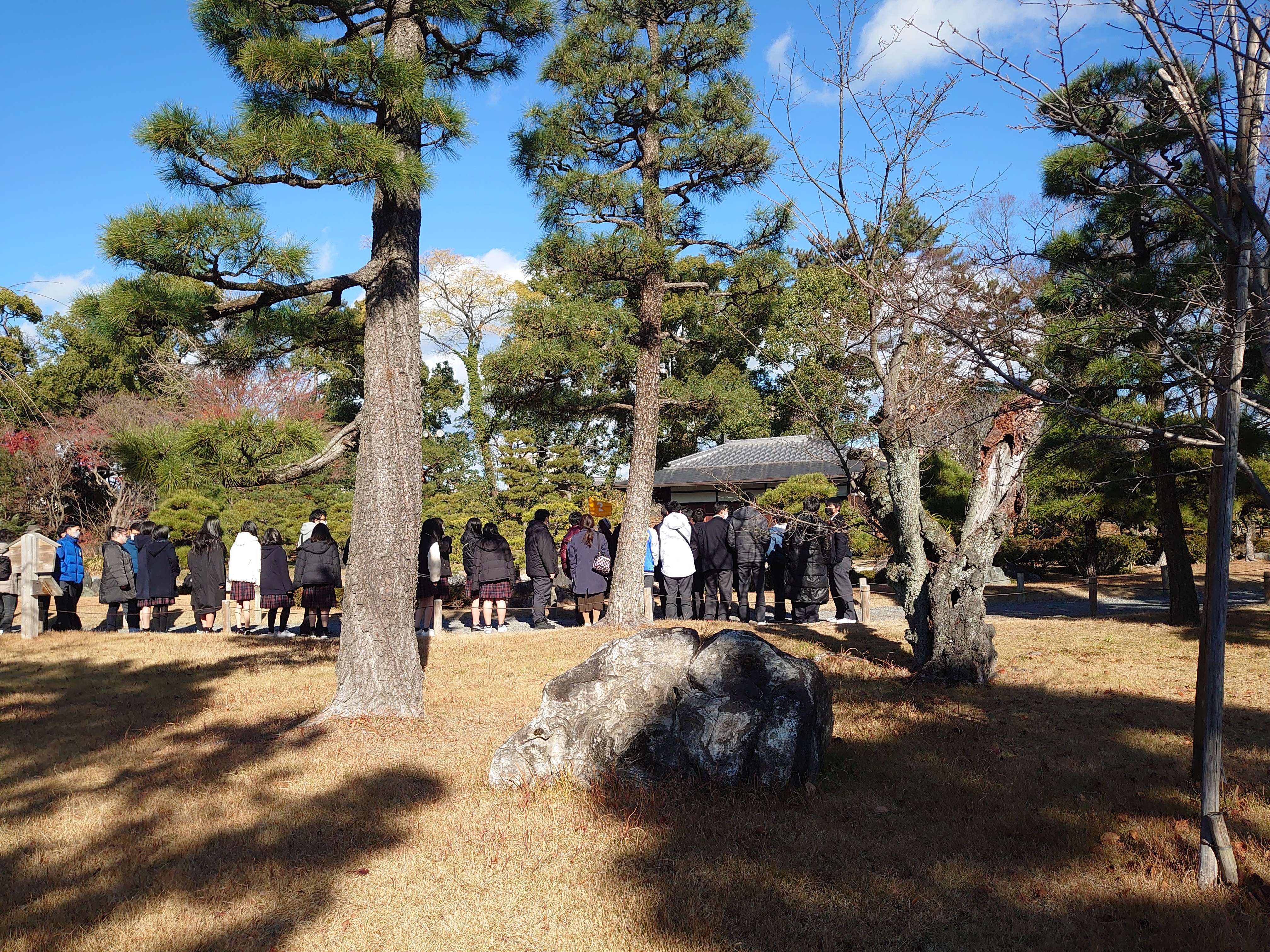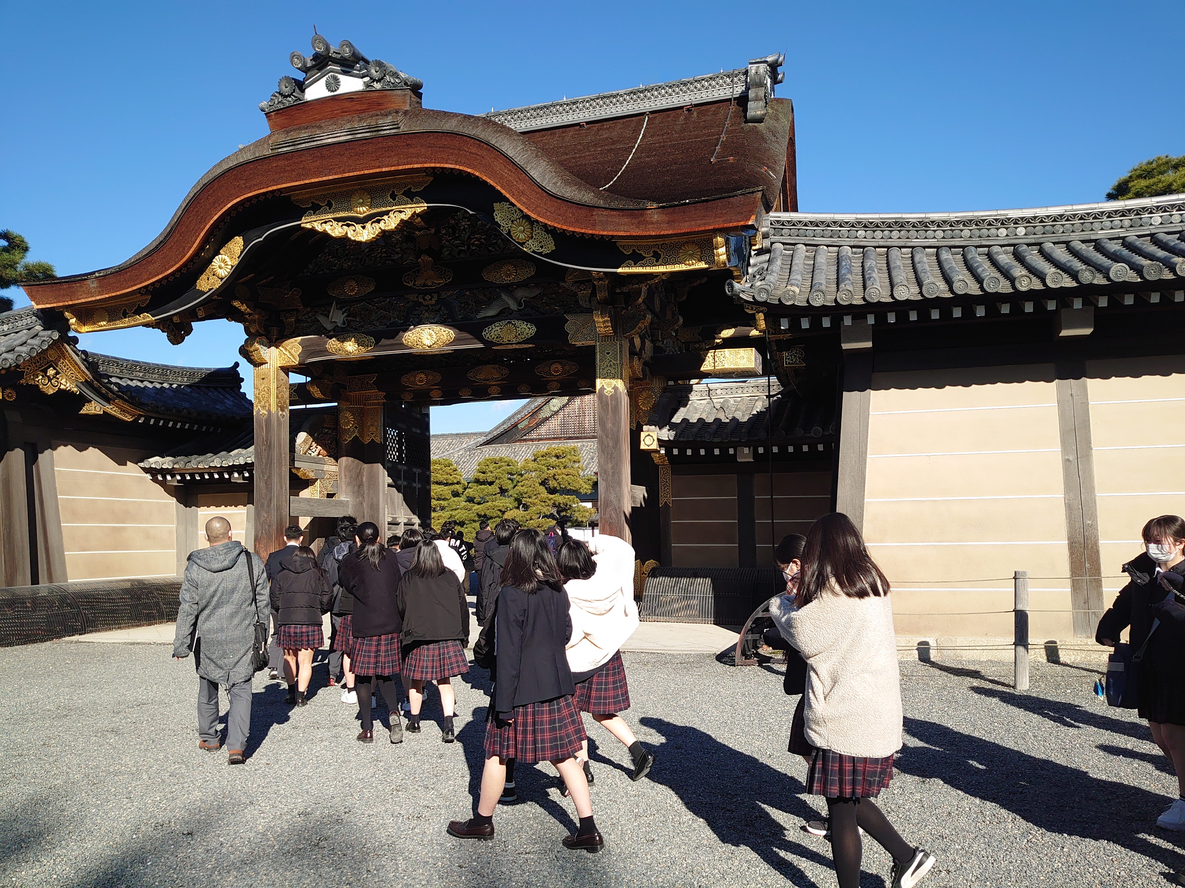 金閣見学終了後は、世界遺産である二条城を見学しました。バス毎に 記念写真を撮影したあと、ガイドさんの案内に従って、城内を見学しま した。二の丸御殿は大政奉還が行われた場所で、国宝にも指定されて いますが、歴史を目の当たりにして、時代や文化を肌で感じることが できました。